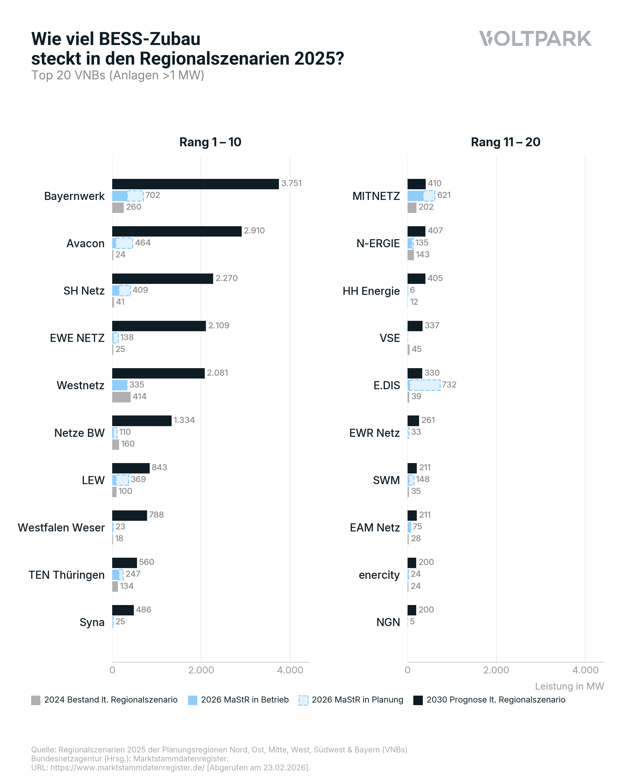Der Abgleich von VNB-Regionalszenarien und dem MaStR-Bestand (02/2026) macht sichtbar, wie ambitioniert die modellierten Ausbaupfade für Batteriegroßspeicher und BESS (> 1 MW) tatsächlich sind und wo sich regionale Schwerpunkte und Diskrepanzen bilden.