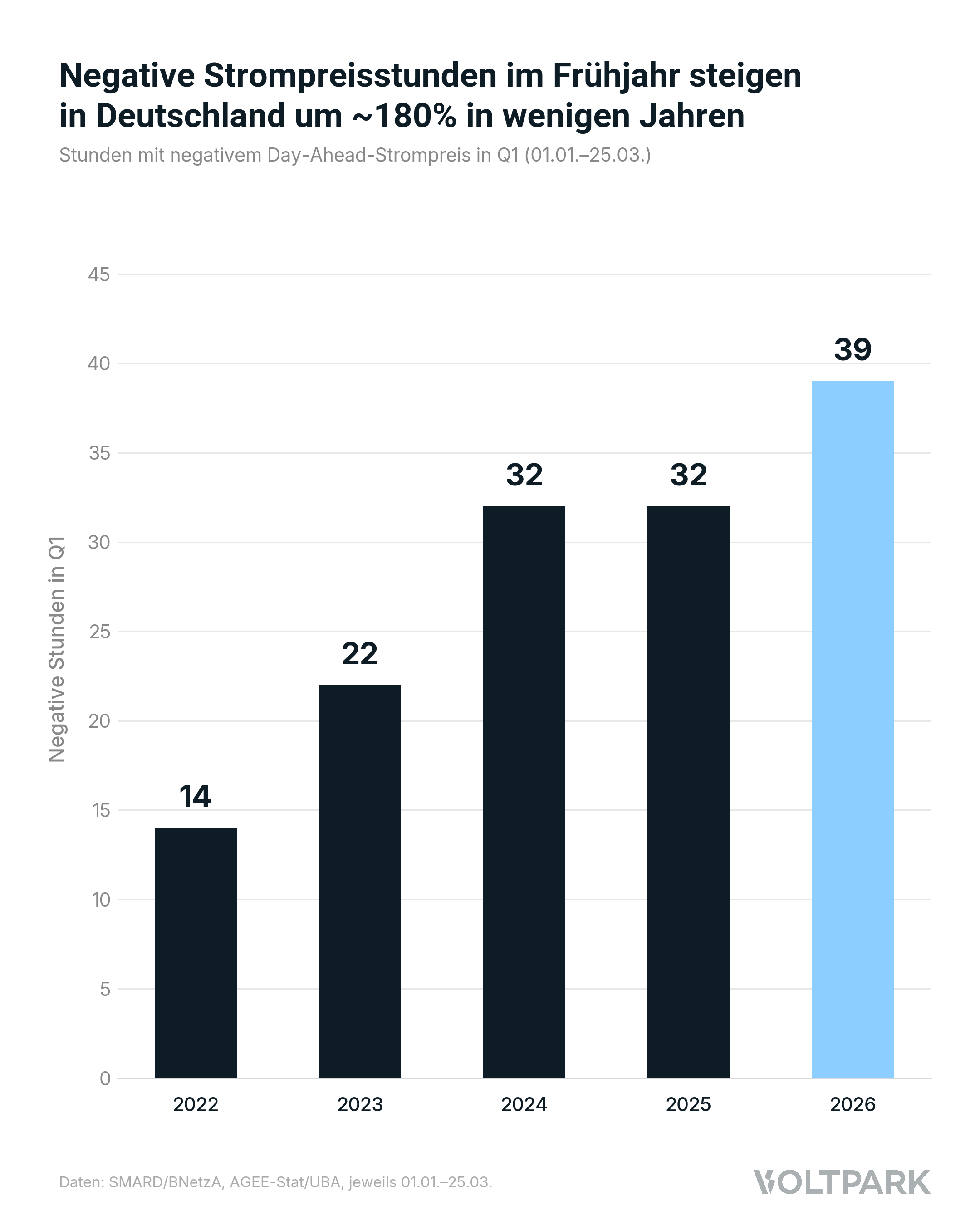 Kumuliert für den Zeitraum 01.01.–25.03. (EPEX Spot DE/LU): Q1 2022 hatte 14 negative Stunden. Q1 2023 kam auf 22. 2024 und 2025 lagen bei jeweils 32. Dieses Jahr bereits 39, und die sonnenreiche Jahreshälfte hat noch nicht begonnen. 2026 ist auf Rekordkurs.